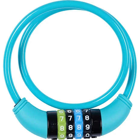 Kabellås med kode i en lys blå farve. Koden kan man nemt kombinere som man vil.