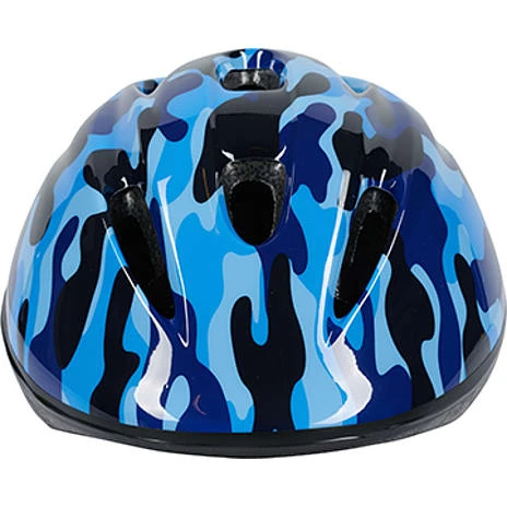 Cykelhjelm med blåt camouflage print. Hjelmen er med regulerbare spænder i hver side samt bagpå hjelmen for hurtig og nem justering af hovedstørrelse. Hjelmen er godkendt efter Europæisk EN1078 standard.