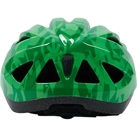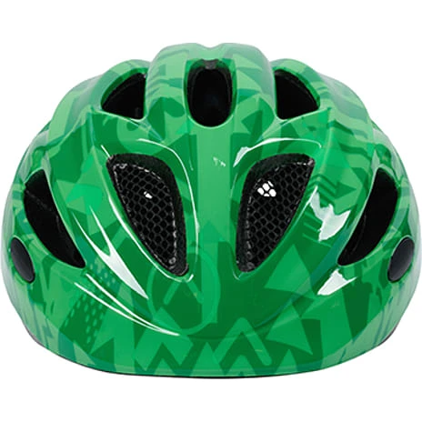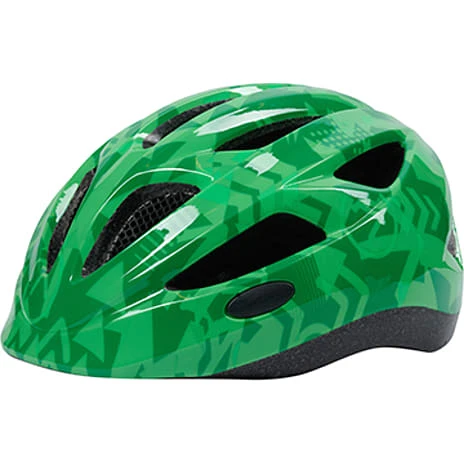 Børnehjelm med grøn pile print. Hjelmen er en inmold hjelm med regulerbare spænder i hver side af hjelmen samt bagpå hjelmen for hurtig og nem justering af hovedstørrelse. Hjelmen er godkendt efter Europæisk EN1078 standard.