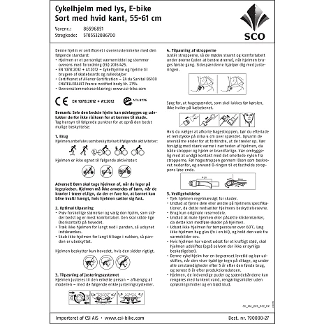 Ebike cykelhjelm i mat sort med hvid kant, 55-61 cm. Hjelmen er forsynet med en iøjnefaldende lygte bagpå samt regulerbare spænder i hver side samt bagpå hjelmen for hurtig justering af hovedstørrelse. Hjelmen er godkendt efter Europæisk EN1078 standard. Derudover har hjelmen den hollandske NTA 8776 godkendelse specielt for ebikes.
