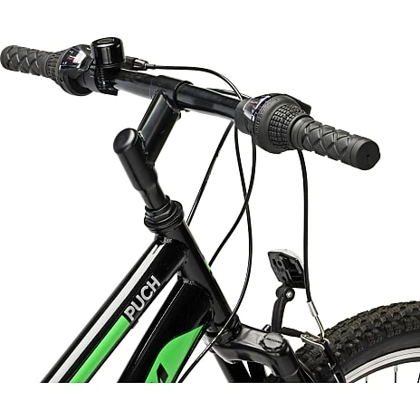PUCH Firestorm 26” grøn/sort er en anderledes men super fed mountainbike, som henvender sig til barnet, der gerne vil kunne køre i skoven og andet ujævnt terræn. Cyklen har affjedring både ved forgaflen samt den bagerste del af stellet. Dermed er cyklen ideel til ujævnt underlag. Samtidig kan cyklen sagtens bruges som skole- og fritidscykel, der skiller sig lidt ud fra andre cykler. Cyklen kommer med 18 udvendige gear, som gør at man kan komme op af de stejleste bakker, samtidig med at der kan gives gas på flad vej. Ydermere har den V-bremser for- og bagtil samt en bøjle ved bagskifteren, som giver gearskifteren ekstra beskyttelse mod slag. Stellet er lavet i stål, mens hjulene er i aluminium og er derfor en robust cykel, der kan klare det meste.