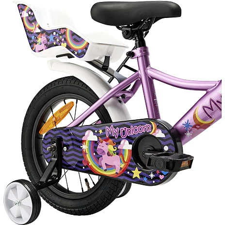 | Tilbehør inkluderet | Støttehjul, skærme, kædeskærm, dukkelstol |
