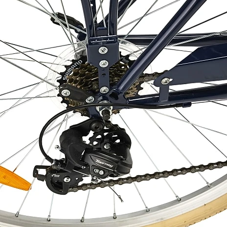 PUCH Old Style er en virkelig fin damecykel til brug rundt i byen. Her er den i en flot blå farve. Cyklen har flotte komponenter, som adskiller sig fra øvrige damecykler, og giver cyklen et frisk udtryk. Cyklen har bagagebærer og kurv foran, som giver mange muligheder for at opbevare tasker, indkøb eller lignende på en god og sikker måde. PUCH Old style er med 7 udvendige gear, som giver et effektivt tråd. Sammen med den komfortable udformning af stellet, fås her en rigtig god cykel, der også kan klare længere distancer. Cyklen har V-bremser foran og bagved.