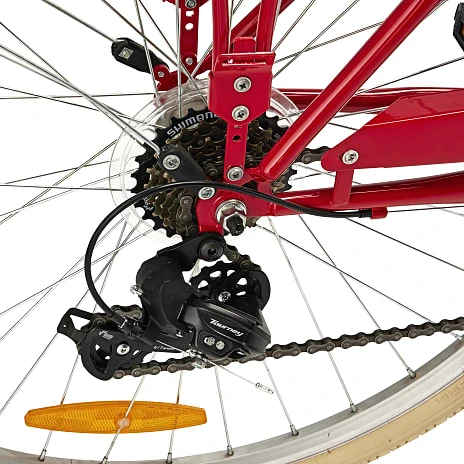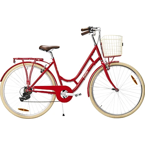 PUCH Old Style er en virkelig fin damecykel til brug rundt i byen. Her er den i en flot rød farve. Cyklen har flotte komponenter, som adskiller sig fra øvrige damecykler, og giver cyklen et frisk udtryk. Cyklen har bagagebærer og kurv foran, som giver mange muligheder for at opbevare tasker, indkøb eller lignende på en god og sikker måde. PUCH Old style er med 7 udvendige gear, som giver et effektivt tråd. Sammen med den komfortable udformning af stellet, fås her en rigtig god cykel, der også kan klare længere distancer. Cyklen har V-bremser foran og bagved.