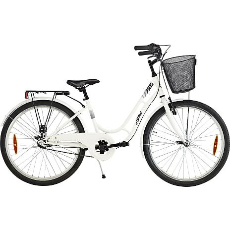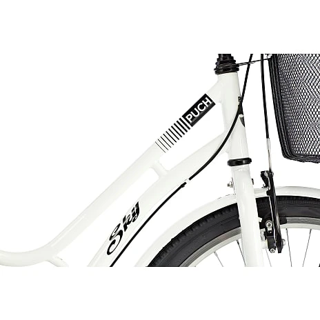 PUCH Sky 24” hvid er en rigtig fin pigecykel, med det samme udstyr som en klassisk damecykel. Det vil sige, at cyklen er monteret med skærme, støttefod, kurv og bagagebærer. Derudover har cyklen 3 indvendige gear. Cyklen er perfekt som skole cykel eller til og fra fritidsaktiviteter. Kurven og bagagebærer gør at tasker og lignende kan opbevares sikkert. Dernæst gør stellet udformning at dit barn sidder komfortabelt på cyklen.