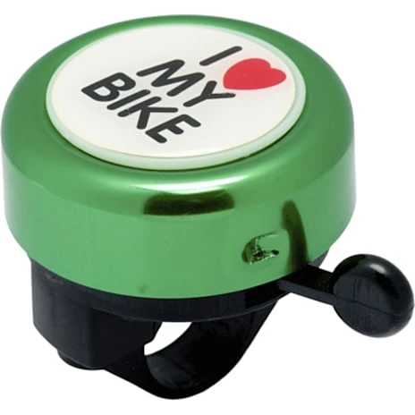 Grøn ringeklokke med “I love my bike” logo, 54 mm i diameter