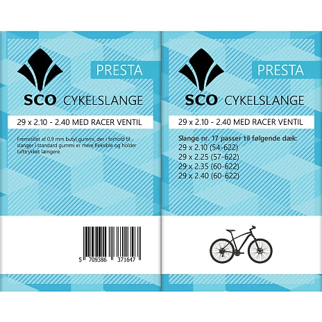 SCO cykelslange med Racer ventil. Passer til følgende størrelser: 29×2.10 (54-622), 29×2.25 (57-622), 29×2.35 (60-622) og 29×2.40 (60-622)