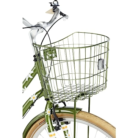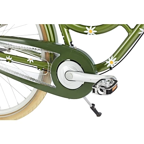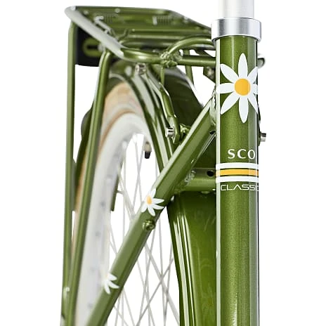 SCO Classic 28” er en ideel bycykel til kvinden der bruger cyklen som transportmiddel i sin dagligdag. Her er modellen i en flot grøn farve med kamilleblomst motiver og med 7 gear. Kamille blomsterne er nænsomt sat på i hånden sådan at cyklen får det helt rette udtryk Cyklen er præget af at være komfortabel samt praktisk. Den er både monteret med kurv fortil samt bagagebærer bagtil, hvilket giver mange muligheder for sikker opbevaring af tasker, indkøb eller lignende. Cyklens geometri og udformning samt sadel med inkorporeret gel i, gør den yderst komfortabel at sidde samt cykle på, således at man kommer behageligt fra A til B, og samtidig kan køre sikkert i trafikken.