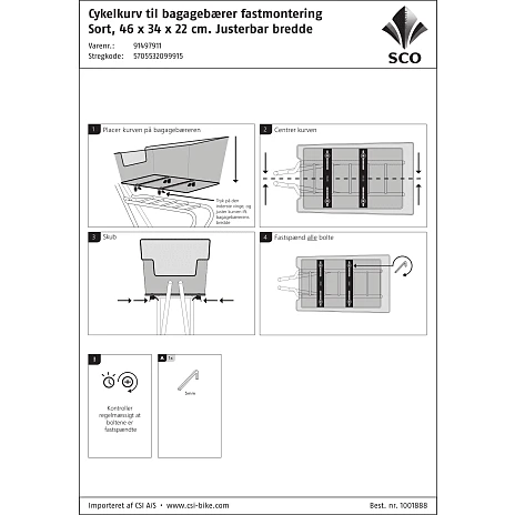 | Tilbehør inkluderet | Cykelkurv i aluminium til fastmontering på bagagebærer. Letvægts aluminiums cykelkurv i et flot stilrent design. Kurven skal anvendes på cyklens bagagebærer, hvor den let fastmonteres ved hjælp af det smarte monteringssystem. Kurvens monteringssystem er med justerbar bredde, og passer til de fleste bagagebærer. |