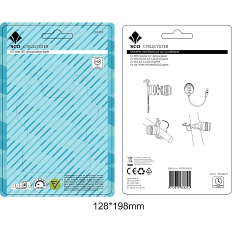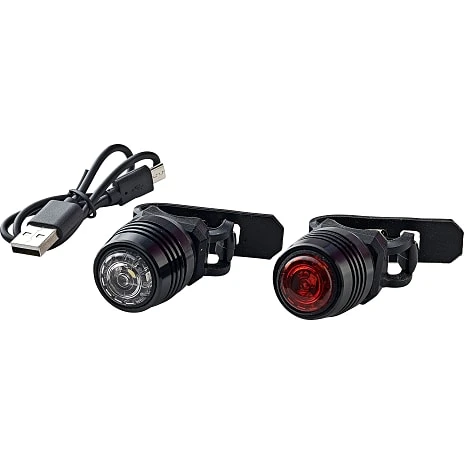 Genopladeligt minilygtesæt. Robust model med lygtehus i aluminium. Enkel montering med universal silikone bånd. Oplades via USB kabel.